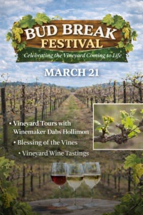 2:00–5:00 PM | Live Music Relax and enjoy live music in the vineyard as the afternoon unfolds Whether you join us for the free festivities or choose to participate in a vineyard tour and tasting, the Bud Break Festival is a beautiful way to welcome spring and celebrate the vineyard’s awakening.