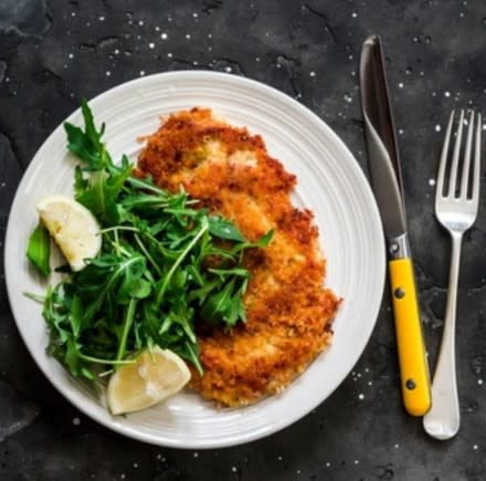 Menu • Grilled Romaine with Chorizo & Cotija Cheese • Seeded Chicken Schnitzel with Arugula & Lemon • Hasselback Potatoes • Balsamic Roasted Carrots • Dark Chocolate Mousse